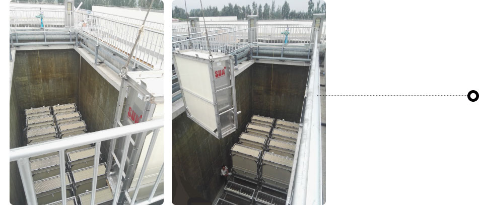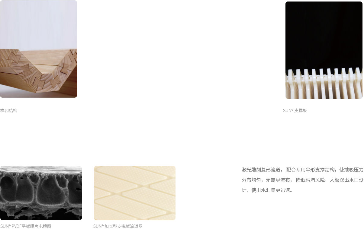 SUN?的平板膜采用PVDF材料,其擁有更好的化學(xué)穩(wěn)定性、抗污染性和機(jī)械強(qiáng)度。公 司采用先進(jìn)的制膜工藝,控制膜孔徑在 0.1um,并且有更高的產(chǎn)水通量和出水 水質(zhì)。板子采 用榫卯配合,膜片間距更穩(wěn)定,無需側(cè)裝板。膜片安裝時,可從頂部向下安裝,也可從側(cè)部 安裝,不受施工現(xiàn)場條件限制。